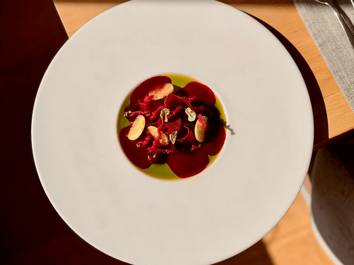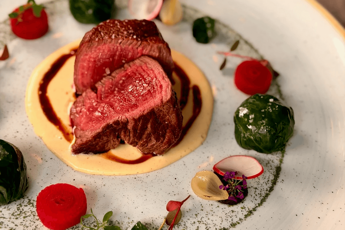 Rôti, jus de canard au ponzu, chou rave comme une tatin,